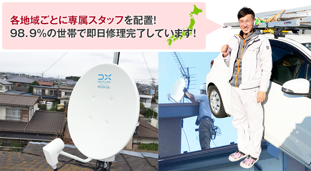 これまでのアンテナ修理工事施工の内98.9%の世帯で、初めてお伺いしたその日のうちに、テレビが映るように修理・補修・交換をしてきました。