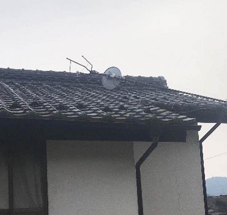 アンテナは屋根から地面に向かって垂れ下がっており、危険な状態!
