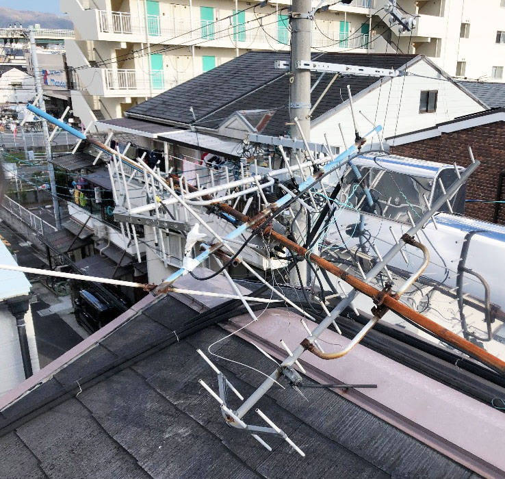 アンテナが倒れていたこともそうですが必要以上にたくさんのアンテナがついており配線も何が何だかわからない状況・・・。