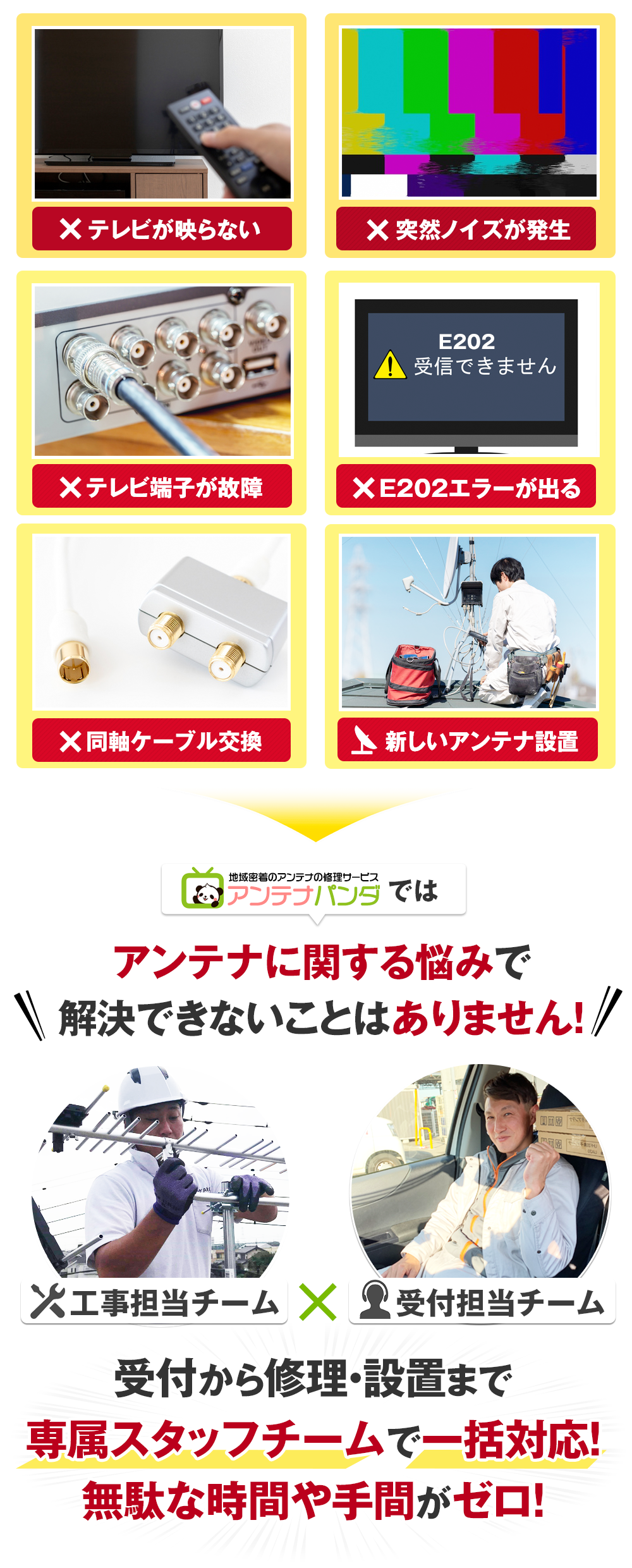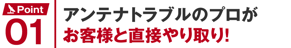 大きなアンテナ修理工事業者などによくある、受付は電話スタッフが、現地調査と見積もりは営業担当が、実際の工事・修理は別業者がというようなわずらわしさはありません。